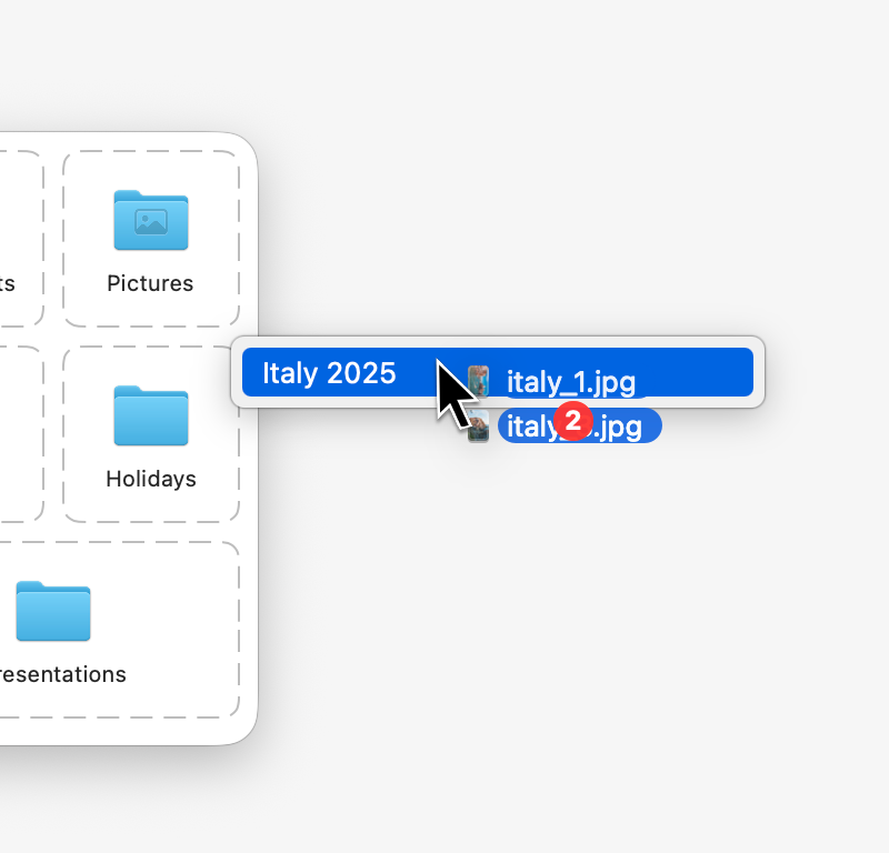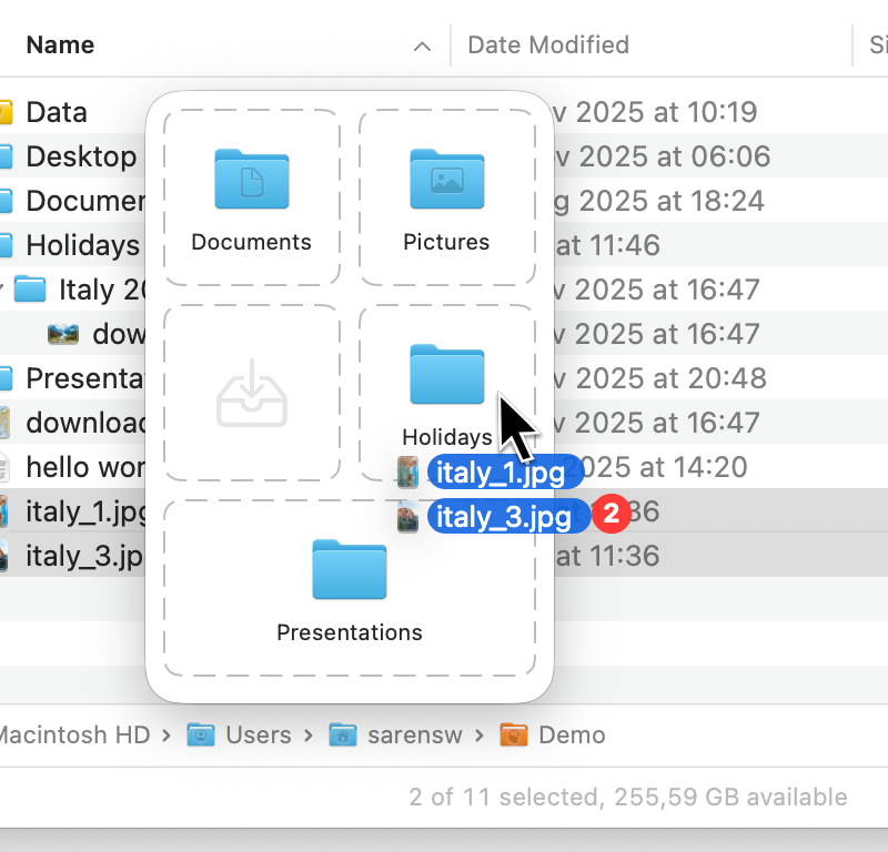 Copy or move files and folders to your favorite folders and their sub-folders. No need to open new Finder windows.